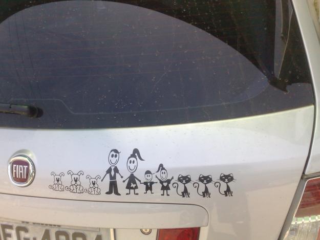 E essa mania de colar na traseira do carro um adesivo com vários bonequinhos de mãos dadas? No meu leigo entender, acho que a ideia é simbolizar a família do motorista. Então se você é casado, tem um filho e um animal de estimação, lá está um casal, uma criança e um cachorrinho estampados no carro. E não importa se sua família é imensa porque tem adesivo para todos os tamanhos, seja com dez filhos ou doze gatos. Agora me diz: pra quê??? Poxa que legal deve ser o motorista de trás saber como é a minha família! E se eu for orfã, encalhada, sofrer bullying entre os "amigos" e detestar animais? Tenho que colar um boneco solitário no meu carro?